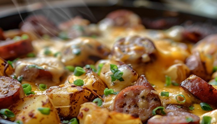 Ingredientes - 4 papas medianas - 200 g de salchicha ahumada, cortada en rodajas - 1 taza de queso cheddar rallado - 1/2 taza de crema agria - 1/4 de taza de cebolla morada, picada - 1/4 de taza de pimientos morrones, picados - 2 cucharadas de aceite de oliva - 1 cucharadita de pimentón …