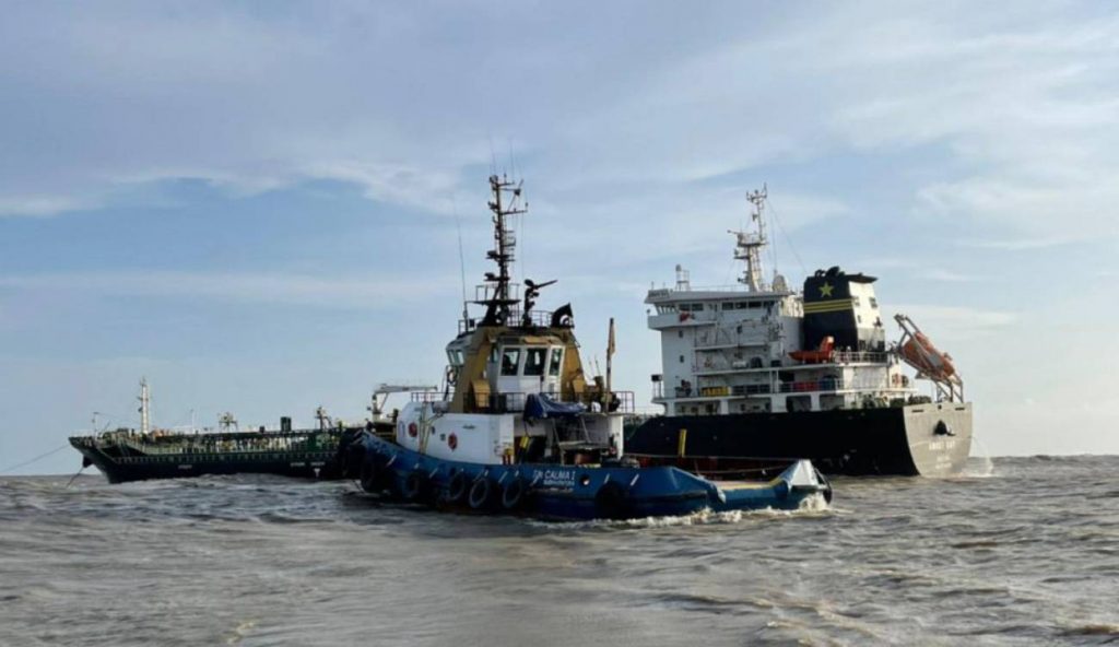 La embarcación con 10 mil toneladas de asfalto permanece encallada en Bocas de ceniza. TOMADA DE:https://caracol.com.co/emisora Autoridades portuarias en conjunto...