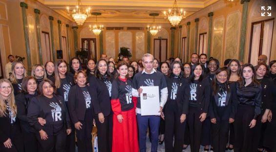 El presidente Luis Abinader junto a la vicepresidenta Raquel Peña; las ministras de Interior y Policía, Faride Raful, …
