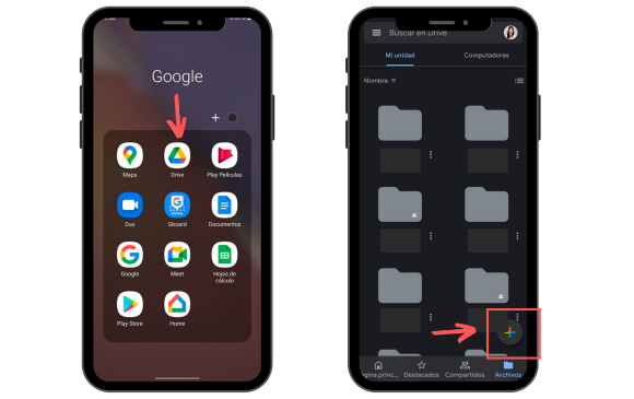 1. Busque la aplicación Google Drive y ábrala. Luego presione el signo “+” (más) que aparece en la esquina inferior derecha.