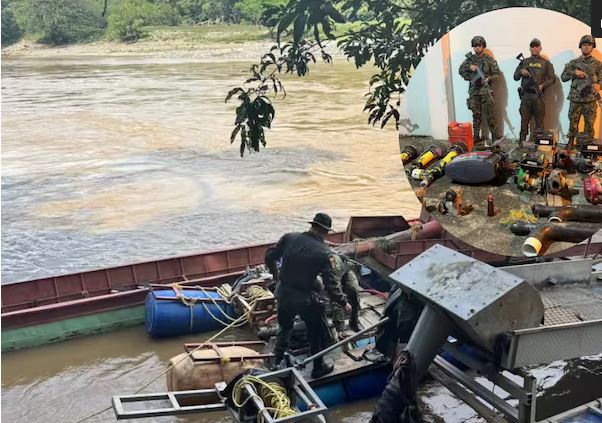 En el lugar se incautaron 2 dragas tipo buzo, un bote canoa, 4 motores industriales, 4 motobombas, 15 galones de combustible, 30 metros de manguera, 300 mililitros de mercurio, un motor fuera de borda, 2 motores de polea, una pimpina de gasolina y varios tubos de extracción mineral.