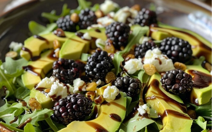 1. En un tazón grande, combina la rúcula, las moras, el aguacate y la cebolla morada.