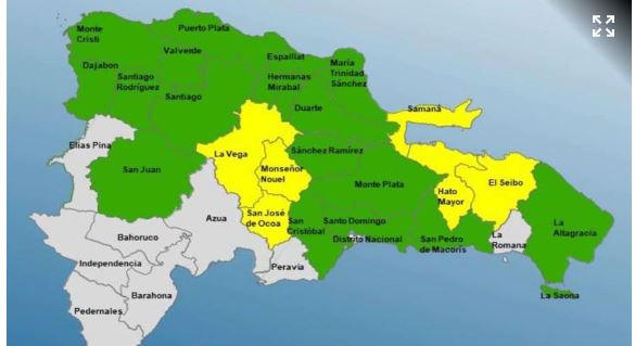 Las provincias en alerta amarilla son: La Vega, Monseñor Nouel, Samaná, San José de Ocoa, El Seibo y Hato Mayor.