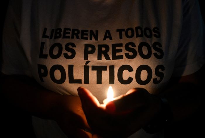 Una persona con una camiseta que dice «Liberen a todos los presos políticos» enciende una vela durante una vigilia frente a la prisión El Rodeo I en Guatire, estado Miranda, Venezuela, el 23 de febrero de 2026. Foto: Federico PARRA / AFP