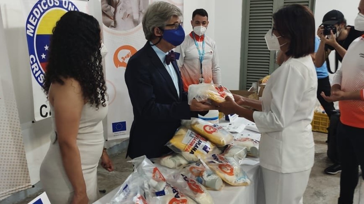 La delegación de la Unión Europea (UE) en Venezuela entregó este miércoles 571 kits con material de protección contra la Covid-19 para el personal sanitario, como parte del proyecto Aplana la Curva, que cuenta con el apoyo de la ONG Convite en alianza con Médicos Unidos de Venezuela.