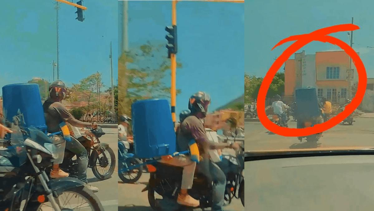 El video está circulando en las redes sociales desde el pasado miércoles, se puede ver a dos personas sobre una motocicleta en plena avenida Pedro de Heredia, a la altura de la glorieta cerca al Mercado de Bazurto. Uno de ellos (el parrillero) en medio del ardiente sol aprovecha para taparse con un tanque de plástico de aproximadamente 12 latas.