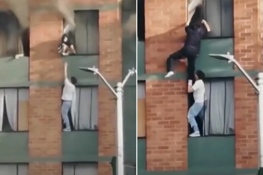 Ella se desliza por la ventana mientras el hombre, parado en el borde de su ventana en el cuarto piso, sostiene sus pies. La mujer termina colgando y, en cuestión de segundos, el ciudadano hoy calificado como héroe la jala hacia el interior de su vivienda. Aunque parece que se golpea en la espalda, afortunadamente se salva del incendio en Bogotá y, además, de una caída que podría haber sido fatal.
